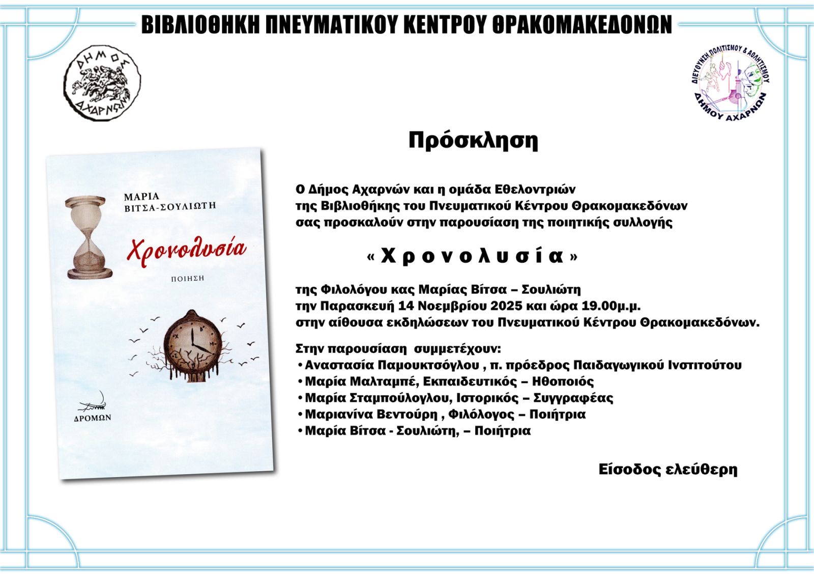 Ο Δήμος Αχαρνών και η ομάδα Εθελοντριών της Βιβλιοθήκης του Πνευματικού Κέντρου Θρακομακεδόνων σας προσκαλούν στην παρουσίαση της ποιητικής συλλογής «Χρονολυσία» της Φιλολόγου κας Μαρίας Βίτσα – Σουλιώτη την Παρασκευή 14 Νοεμβρίου 2025 και ώρα 19.00 μ.μ. στην αίθουσα εκδηλώσεων του Πνευματικού Κέντρου Θρακομακεδόνων.