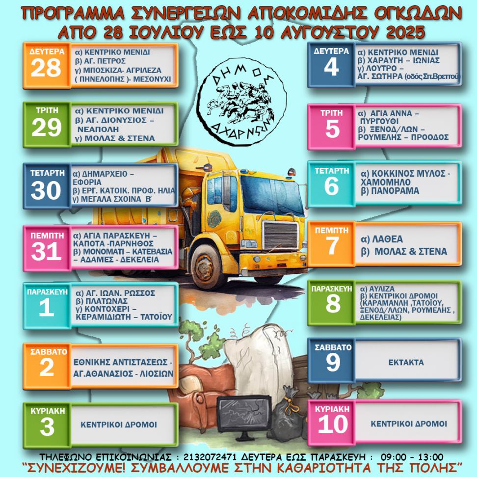 Η Διεύθυνση Καθαριότητας και Ανακύκλωσης του Δήμου Αχαρνών ανακοινώνει το πρόγραμμα αποκομιδής ογκωδών αντικειμένων για το διάστημα από 28 Ιουλίου έως 10 Αυγούστου.