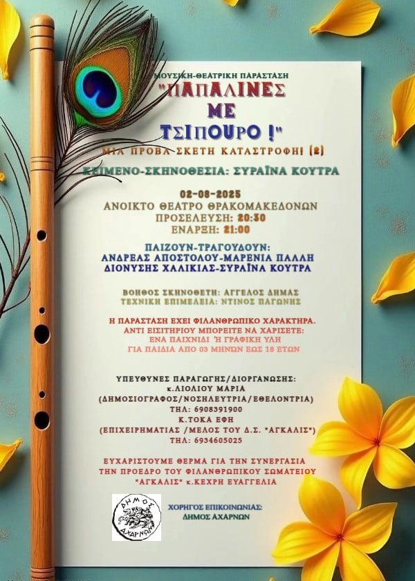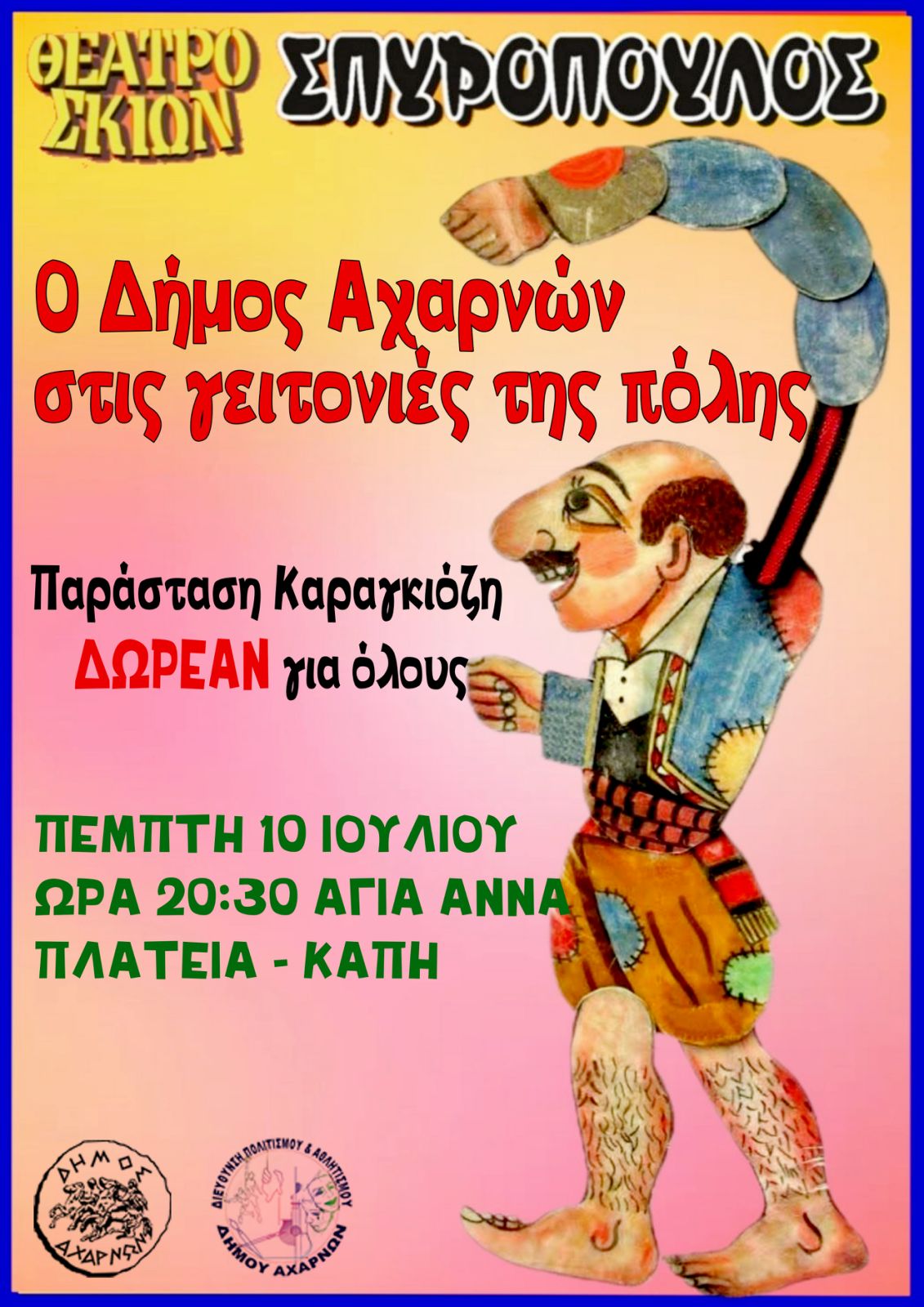 Στο πλαίσιο της δράσης «Ο Δήμος Αχαρνών στις γειτονιές της πόλης», ο Δήμος Αχαρνών μέσω της Διεύθυνσης Πολιτισμού και Αθλητισμού προσκαλούν μικρούς και μεγάλους σε μία μοναδική βραδιά με παράσταση Καραγκιόζη από το Θέατρο Σκιών Σπυρόπουλος.