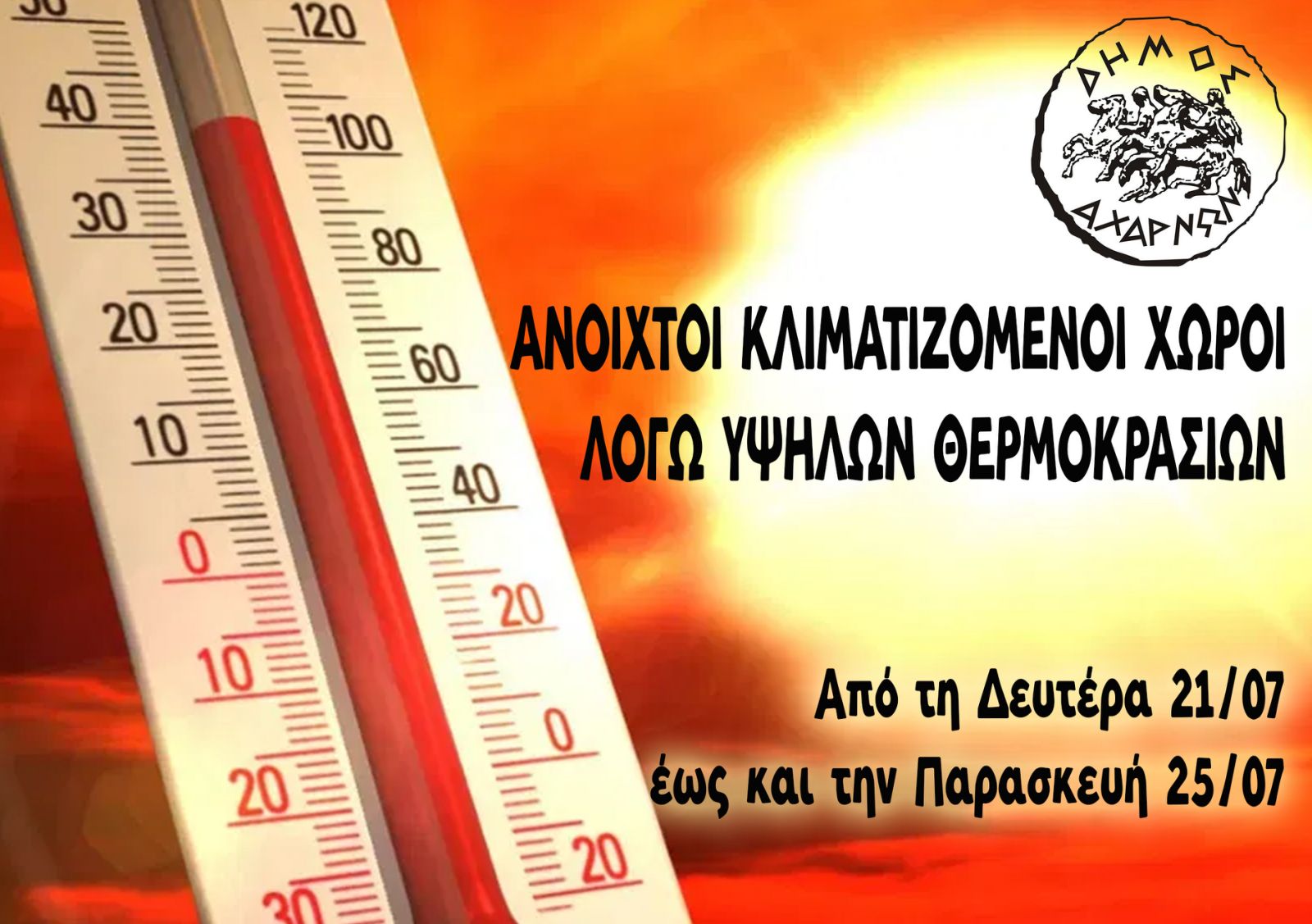 Εξαιτίας των υψηλών θερμοκρασιών που προβλέπονται τις επόμενες ημέρες, ο Δήμος Αχαρνών διαθέτει κλιματιζόμενο χώρο στο ισόγειο του κτιρίου Διοικητικών Υπηρεσιών του Δημαρχείου, προκειμένου να προσφέρει ανακούφιση και προστασία σε ευπαθείς ομάδες καθώς και σε κάθε πολίτη που το χρειάζεται.