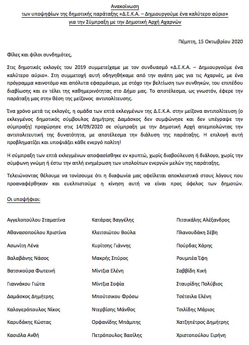 Ανακοίνωση εξέδωσε η δημοτική παράταξη "Δ.Ε.Κ.Α-Δημιουργούμε ένα καλύτερο αύριο για ένα καλύτερο αύριο" όσον αφορά την Σύμπραξη με την Δημοτική Αρχή Αχαρνων: