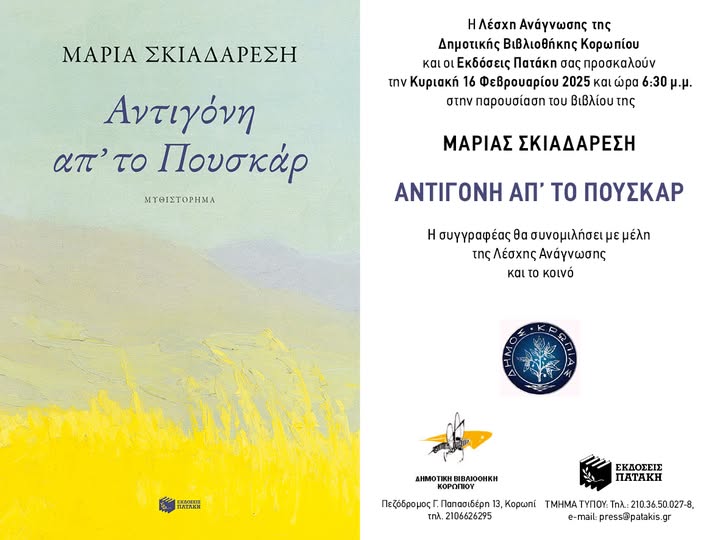Η ΛΕΣΧΗ ΑΝΑΓΝΩΣΗΣ ΚΟΡΩΠΙΟΥ παρουσιάζει : Το εξαιρετικό, καλοδουλεμένο μυθιστόρημα «Αντιγόνη απ’ το Πουσκάρ», με καλεσμένη την συγγραφέα του Μαρία Σκιαδαρέση, παρουσιάζει η Λέσχη Ανάγνωσης Κορωπίου την Κυριακή 16/2/2025 ώρα 6:30 στη Δημοτική Βιβλιοθήκη Κορωπίου.