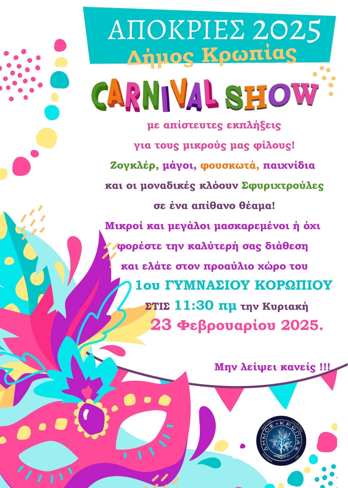 Aποκριάτικη Εκδήλωση Δήμου Κρωπίας Κυριακή 23 Φεβρουαρίου 2025, 11.30πμ, 1ο Γυμνάσιο Κορωπίου.