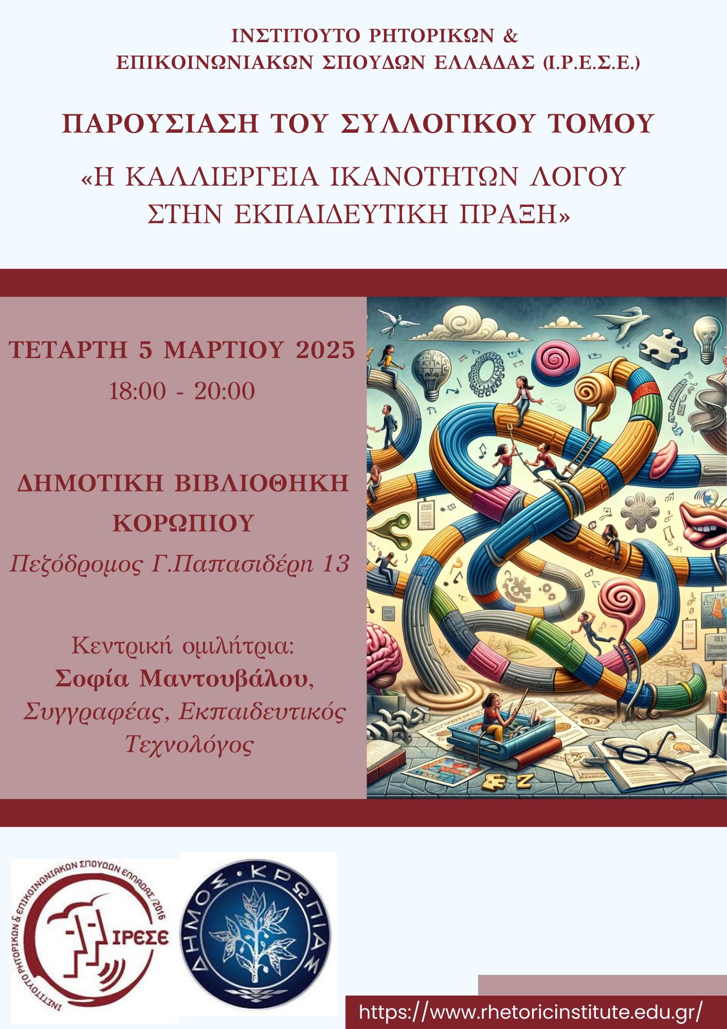 Δημοτική Βιβλιοθήκη : Το Ινστιτούτο Ρητορικών & Επικοινωνιακών Σπουδών Ελλάδας (Ι.Ρ.Ε.Σ.Ε.) σε συνεργασία με τη Δημοτική Βιβλιοθήκη Κορωπίου σας προσκαλεί στην παρουσίαση του 3ου συλλογικού τόμου «Η Καλλιέργεια Ικανοτήτων Λόγου στην Εκπαιδευτική Πράξη».