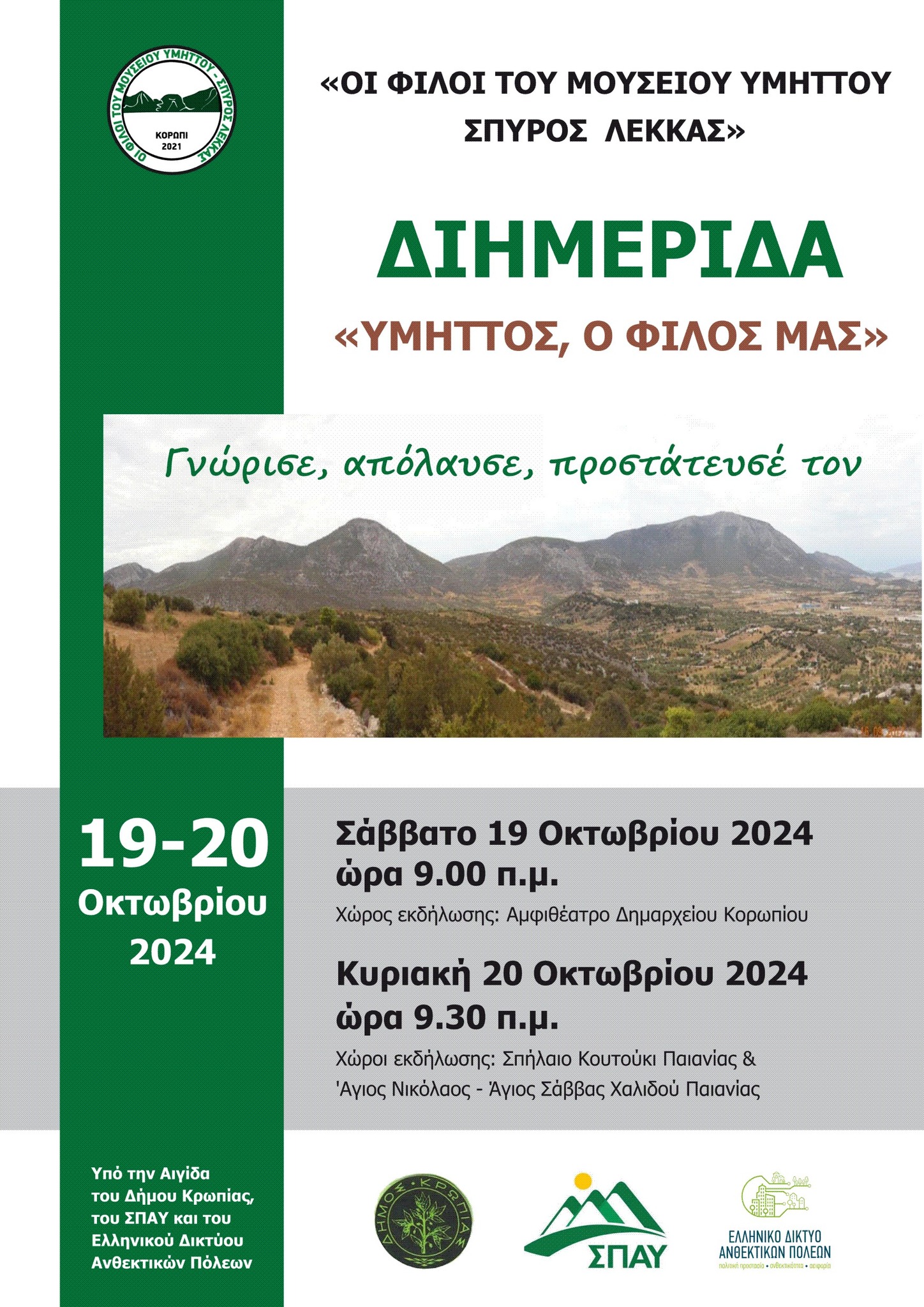 Το Σωματείο «Οι φίλοι του Μουσείου Υμηττού – Σπύρος Λέκκας», οργανώνει την Διημερίδα «Υμηττός, ο φίλος μας - Γνώρισε, απόλαυσε και προστάτευσέ τον», που θα πραγματοποιηθεί το Σάββατο και την Κυριακή 19 και 20 Οκτωβρίου 2024. Η Διημερίδα τελεί υπό την αιγίδα του Δήμου Κρωπίας, του Συνδέσμου Προστασίας και Ανάπτυξης Υμηττού (ΣΠΑΥ) και του Ελληνικού Δικτύου Ανθεκτικών Πόλεων (ΕλΔΑΠ).