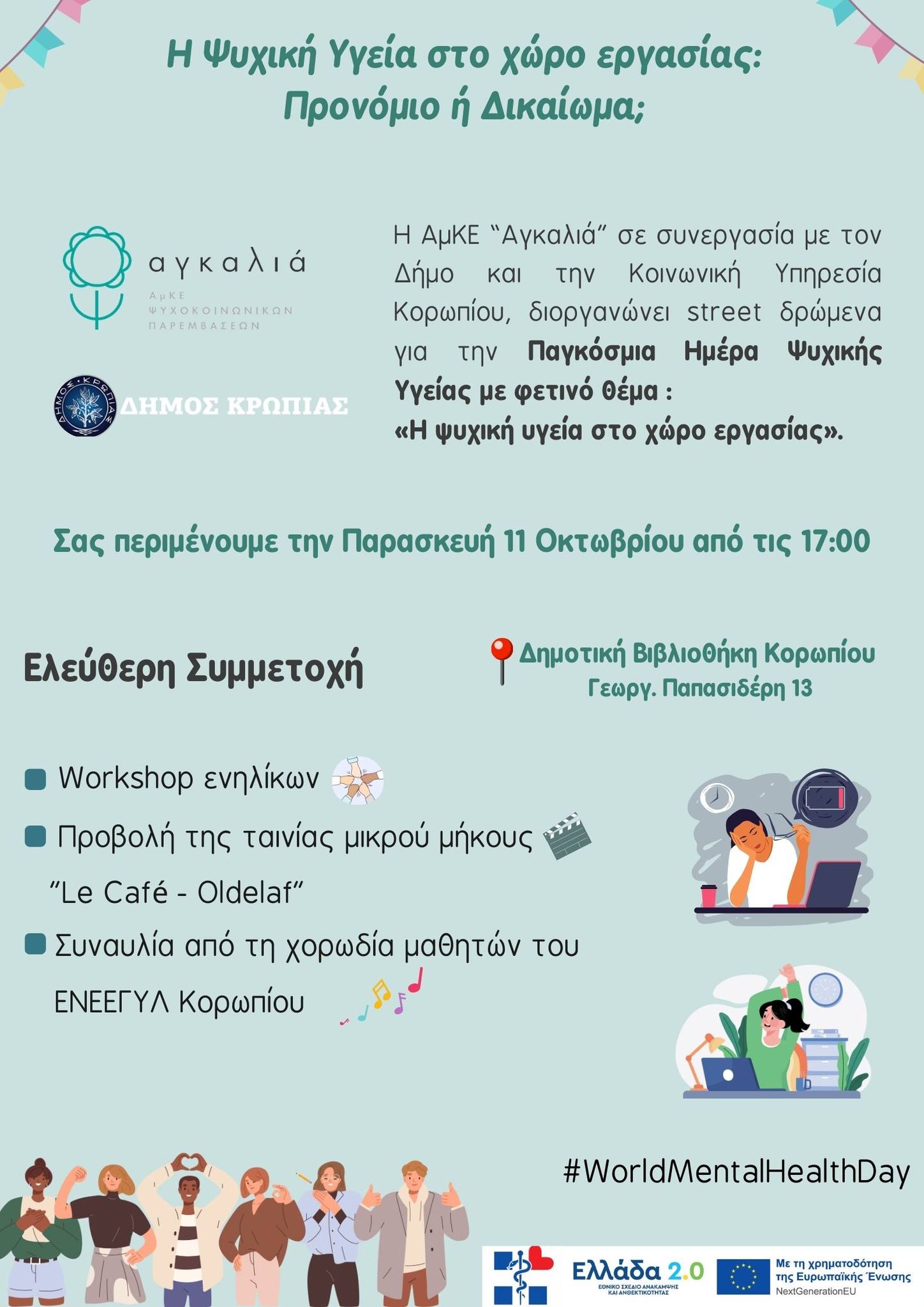 Στο πλαίσιο της Παγκόσμιας Ημέρας Ψυχικής Υγείας, η ΑμΚΕ "ΑΓΚΑΛΙΑ" σε συνεργασία με το Δήμο Κρωπίας διοργανώνει την Παρασκευή 11 Οκτωβρίου street δρώμενα στον πεζόδρομο Γεωργ. Παπασιδέρη 13 έξω από τη Δημοτική Βιβλιοθήκη.