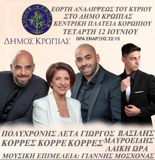 Την Τετάρτη 12 Ιουνίου (παραμονή) και την Πέμπτη 13 Ιουνίου 2024 (ανήμερα) εορτάζει ο Δήμος Κρωπίας και πανηγυρίζει ο Ιερός Καθεδρικός Ναός Αναλήψεως του Κυρίου της πόλης του Κορωπίου (τοπική αργία η Πέμπτη 13 Ιουνίου 2024 Π.Δ. 49/2022, ΦΕΚ121Α/22.06.2022).To πλήρες πρόγραμμα του Εορτασμού είναι το ακόλουθο: