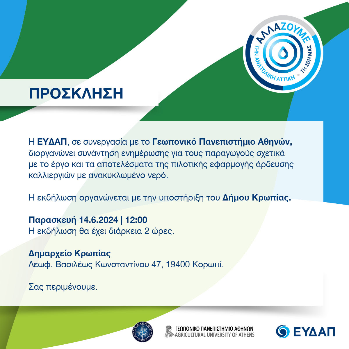 Eνημερωτική εκδήλωση ενημέρωσης ΕΥΔΑΠ και Γεωπονικού Πανεπιστημίου Αθηνών, την Παρασκευή 14 Ιουνίου 2024, στο Δημαρχείο Κρωπίας, στις 12.00 με αγρότες -παραγωγούς.