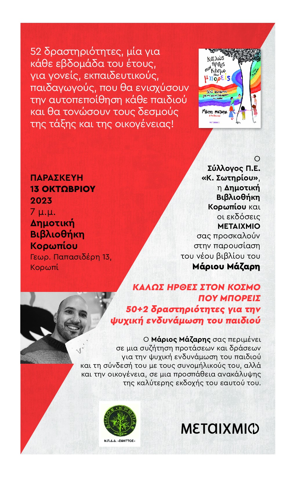 Ο σύλλογος Π.Ε. «Κ. Σωτηρίου» και η Δημοτική Βιβλιοθήκη Κορωπίου σας καλούν στην παρουσίαση του βιβλίου του συναδέλφου -εκπαιδευτικού πρωτοβάθμιας εκπαίδευσης Μάριου Μάζαρη.