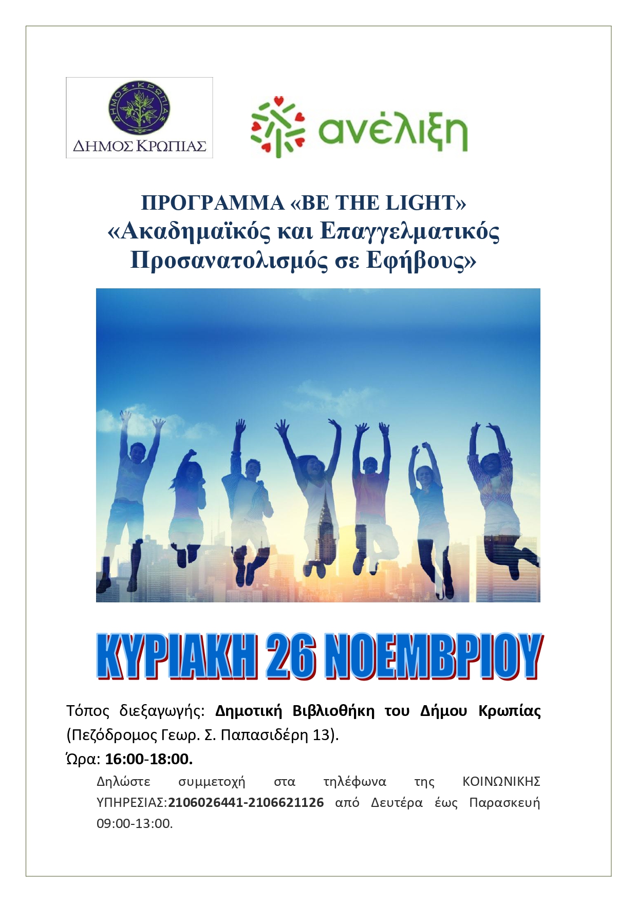 «Ακαδημαϊκός και Επαγγελματικός Προσανατολισμός σε Εφήβους». Οι έφηβοι καλούνται να παρακολουθήσουν το πρόγραμμα για μία Κυριακή κάθε μήνα 16:00-18:00 στη Δημοτική Βιβλιοθήκη του Δήμου Κρωπίας (Πεζόδρομος Γεωρ. Σ. Παπασιδέρη 13).