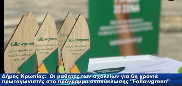 Ο Δήμος Κρωπίας, στο πλαίσιο της δημοτικής πλατφόρμας επιβράβευσης της ανακύκλωσης «Followgreen» και με link: followgreen.gr/koropi, συνεχίζει για 6η σχολική χρονιά 2023 – 2024 τη δράση «Πάμε Ανακύκλωση» στις σχολικές μονάδες των Νηπιαγωγείων, Δημοτικών, Γυμνασίων και Λυκείων.