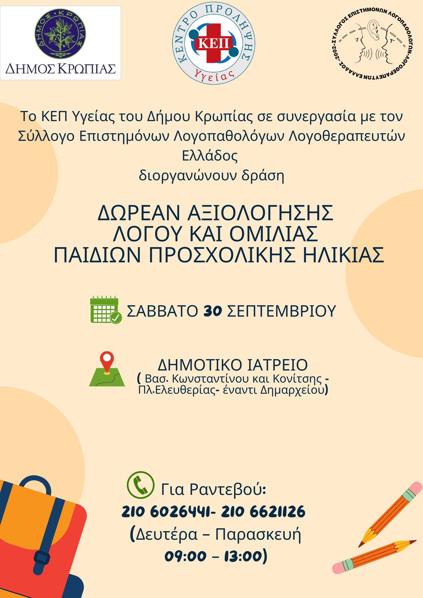 Το ΚΕΠ Υγείας του Δήμου Κρωπίας σε συνεργασία με τον Σύλλογο Επιστημόνων Λογοπαθολόγων Λογοθεραπευτών Ελλάδος διοργανώνει το Σάββατο 30 ΣΕΠΤΕΜΒΡΙΟΥ , ΔΩΡΕΑΝ ΑΞΙΟΛΟΓΗΣΗ ΛΟΓΟΥ ΚΑΙ ΟΜΙΛΙΑΣ ΠΑΙΔΙΩΝ ΠΡΟΣΧΟΛΙΚΗΣ ΗΛΙΚΙΑΣ στο Δημοτικό Ιατρείο (Βασ. Κωνσταντίνου και Κονίτσης , Πλ. Ελευθερίας, έναντι Δημαρχείου).