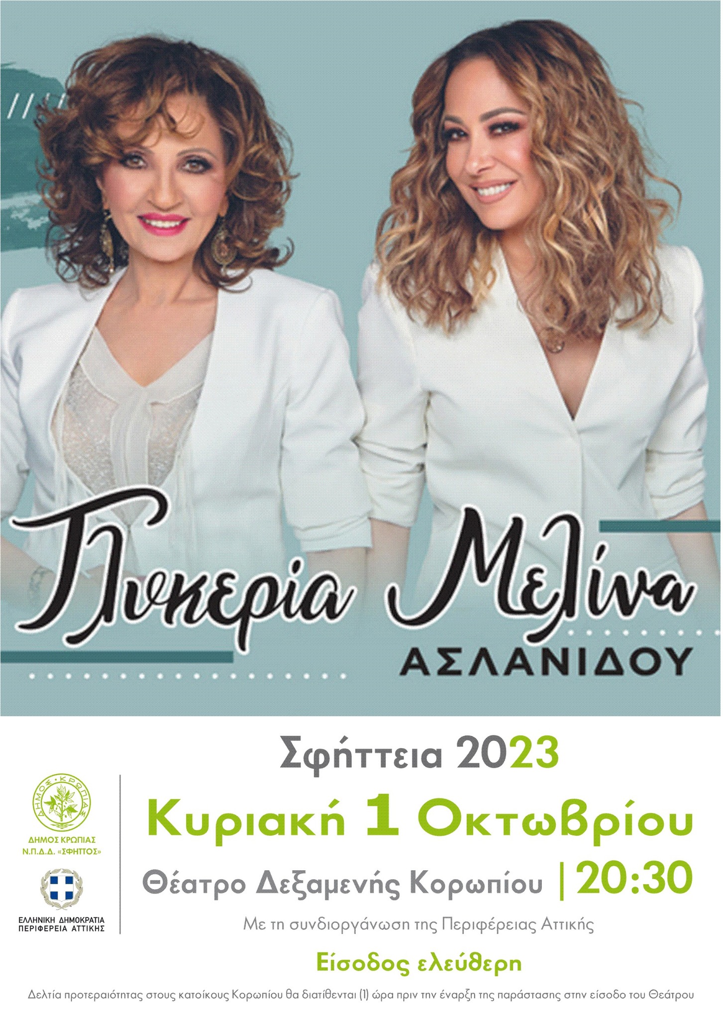 Η συναυλία της ΓΛΥΚΕΡΙΑΣ και της ΜΕΛΙΝΑΣ ΑΣΛΑΝΙΔΟΥ θα γίνει την ΚΥΡΙΑΚΗ 1 ΟΚΤΩΒΡΙΟΥ 2023, 20:30, Θέατρο πλ.Δεξαμενής