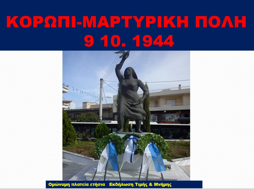 Η 79η επέτειος του Ολοκαυτώματος του Κορωπίου : Δευτέρα 9 Οκτωβρίου 2023 Πλατεία 9ης Οκτωβρίου 1944 , 11:00 (Λ. Β.Κωνσταντίνου κοντά στο Α΄ Δημοτικό Κοιμητήριο)
