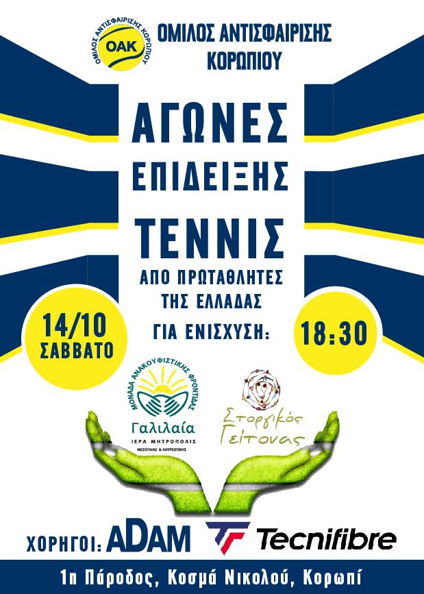 Ο Όμιλος Αντισφαίρισης Κορωπίου σας προσκαλεί στην φιλανθρωπική εκδήλωση που θα λάβει χώρα στις εγκαταστάσεις του ομίλου μας (1η Πάροδος Κοσμά Νικολού), το Σάββατο 14 Οκτωβρίου και ώρα 18.30, για την ενίσχυση της Γαλιλαίας και του Στοργικού Γείτονα.