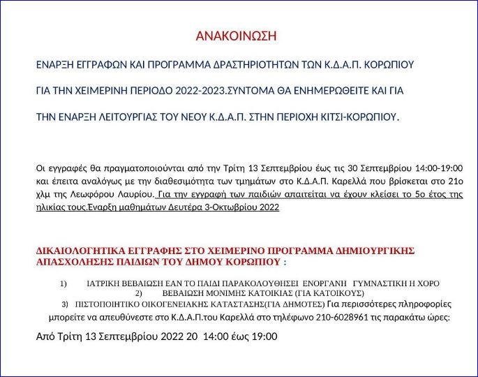 Η Ημερίδα θα διεξαχθεί σήμερα, Δευτέρα 19 Δεκεμβρίου 2022 και ώρα 17:00 στο αμφιθέατρο του Δήμου Κορωπίου, στην οδό Β. Κωνσταντίνου 47 Κορωπί.