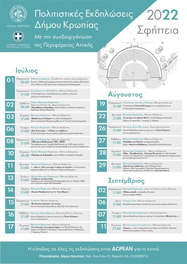 20:301ο Γυμνάσιο Κορωπίου-αύλειος χώρος : Παρουσίαση Ελληνικών Παραδοσιακών Χορών από τις χορευτικές ομάδες, του Λυκείου Ελληνίδων Κορωπίου,του συλλόγου ΚρητώνΚορωπίου «Ο Ψηλορείτης»,του Συλλόγου Θρακιωτών Κορωπίου, του Τμήματος Ελληνικών Χορών του ΝΠΔΔ «ΣΦΗΤΤΟΣ» Δήμου Κρωπίας,  του Πνευματικού Κέντρου Ι.Ν. Κοιμήσεως Θεοτόκου Κιτσίου, του Συλλόγου Ηπειρωτών Κορωπίου.