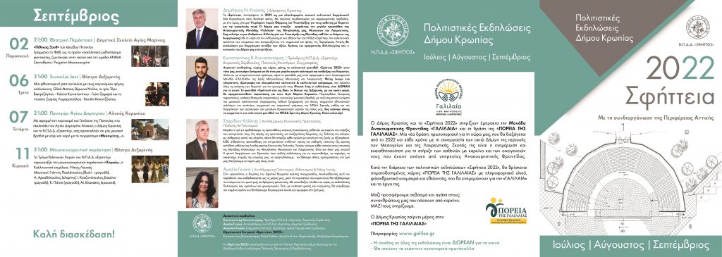 «Προσκαλούμε τους πολίτες του Δήμου μας να περπατήσουμε όλοι μαζί, την Τρίτη 7 Ιουνίου 2022, ώρα 19:00, στην έδρα της  Ανακουφιστικής Μονάδας της Ιεράς Μητρόπολης Μεσογαίας και Λαυρεωτικής «Γαλιλαία» στα Σπάτα στην συμβολική πορεία που διοργανώνουμε 8 Δήμοι των Μεσογείων για να υποστηρίξουμε τους ασθενείς με Καρκίνο και τις οικογένειές τους. Είναι μια μεγάλη προσπάθεια βελτίωσης της ποιότητας ζωής τους. Για το Δήμο Κρωπίας, είναι μια υπερήφανη πορεία Θάρρους και Υποστήριξης για τους ασθενείς και τις οικογένειες τους! Επιπλέον, στηρίζουμε  εμπράκτως την μεγάλη προσπάθεια της Μητρόπολης μας, με την αφιέρωση των φετινών πολιτιστικών εκδηλώσεων Σφήττεια 2022 στη «Γαλιλαία».
