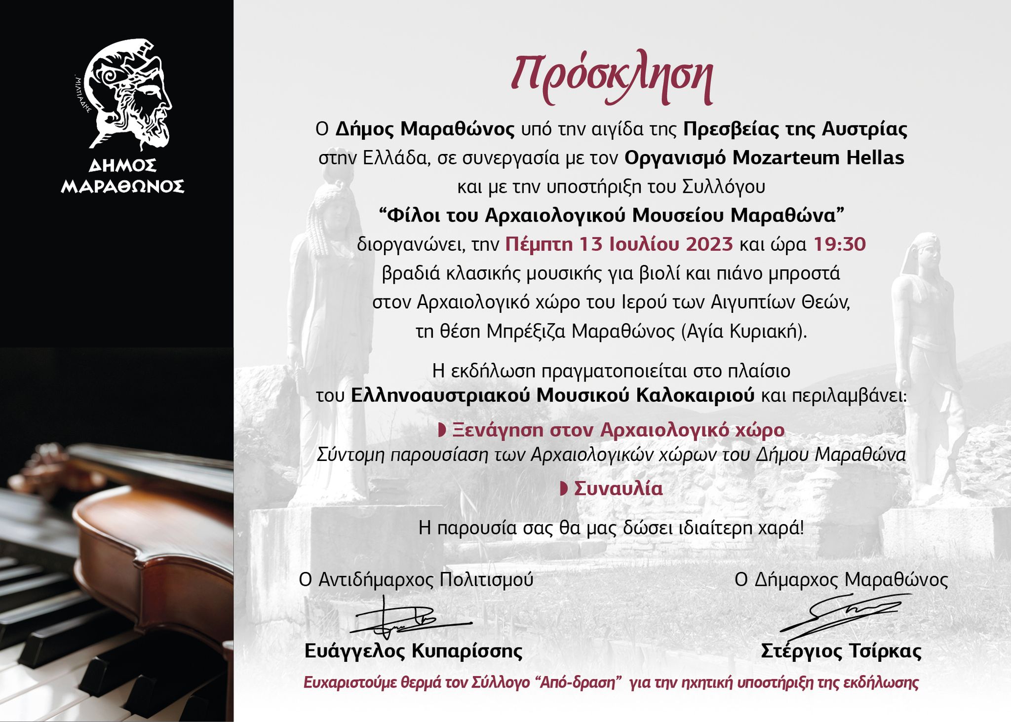 Ο Δήμος Μαραθώνος υπό την αιγίδα της Πρεσβείας της Αυστρίας στην Ελλάδα, σε συνεργασία με τον Οργανισμό Mozarteum Hellas και με την υποστήριξη του συλλόγου “Φίλοι του Αρχαιολογικού Μουσείου Μαραθώνα”, διοργανώνει την Πέμπτη 13 Ιουλίου 2023 και ώρα 19:30, βραδιά κλασικής μουσικής για βιολί και πιάνο μπροστά στον Αρχαιολογικό χώρο του Ιερού των Αιγυπτίων Θεών στη θέση Μπρέξιζα Μαραθώνος (Αγία Κυριακή).