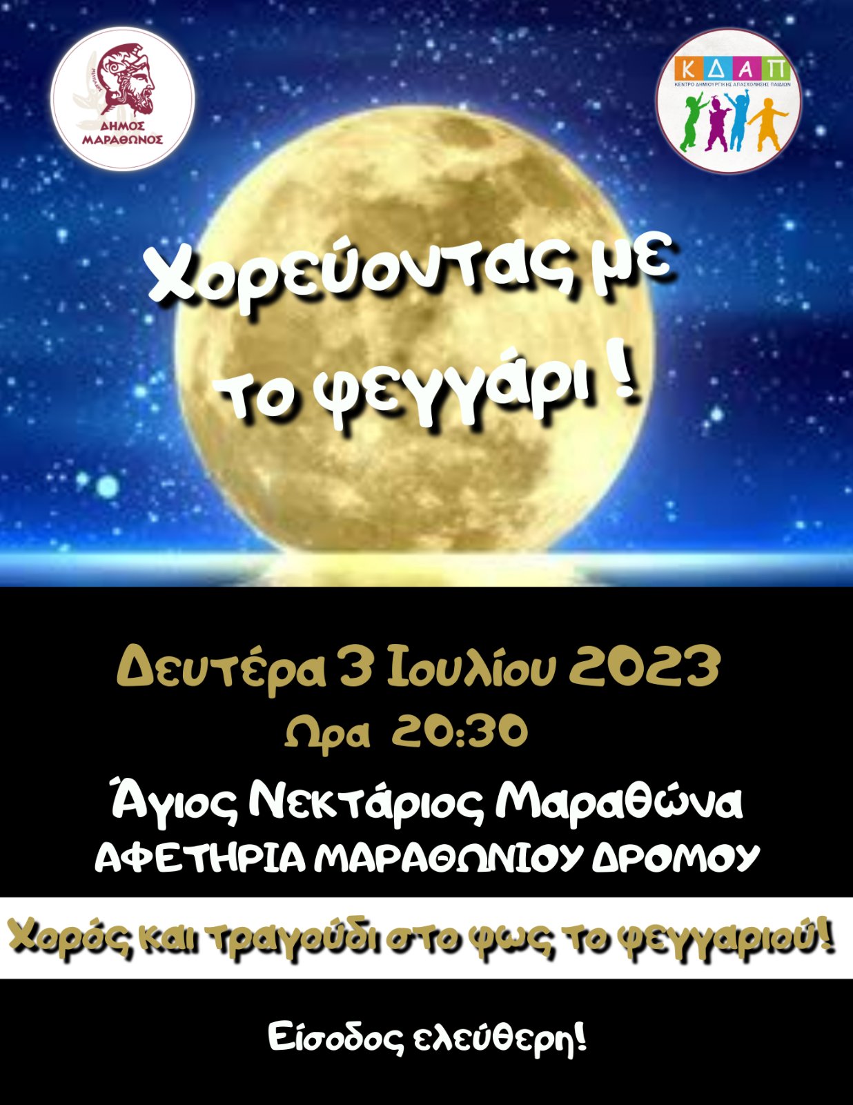 Ο Δήμος Μαραθώνος και τα ΚΔΑΠ σας προσκαλούν σε μια γιορτή κάτω από το φεγγάρι την Δευτέρα 3 Ιουλίου 2023 στις 20:30 στον εκκλησάκι του Αγίου Νεκταρίου στην Αφετηρία Μαραθωνίου Δρόμου.