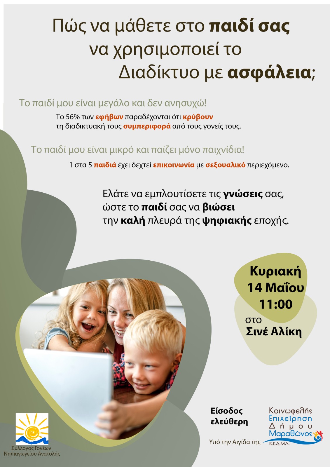Την Κυριακή 14 Μαίου 2023 στις 11.00 στο Σινέ Αλίκη ημερίδα με θέμα "Πως να μάθετε στο παιδί σας να χρησιμοποιεί το διαδίκτυο με ασφάλεια".