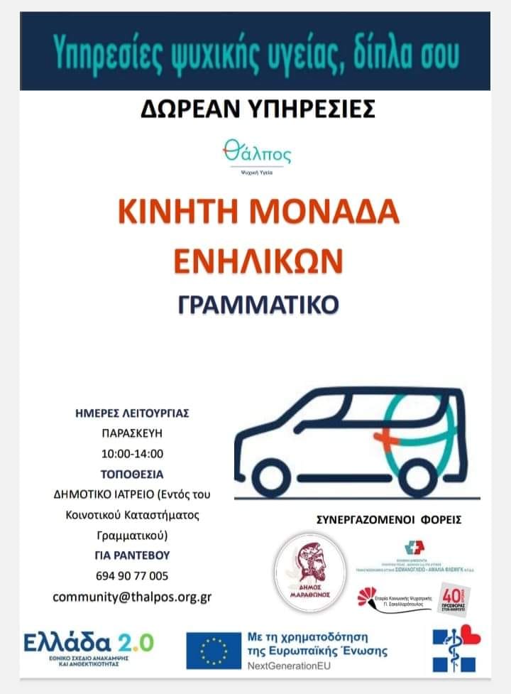 Από την Παρασκευή 21 Απριλίου και κάθε Παρασκευή η Κινητή Μονάδα "Θάλπος-Ψυχική Υγεία" θα βρίσκεται στο Δημοτικό Ιατρείο εντός του Κοινοτικού Καταστήματος Γραμματικού κατά τις ώρες 10.00-14.00
