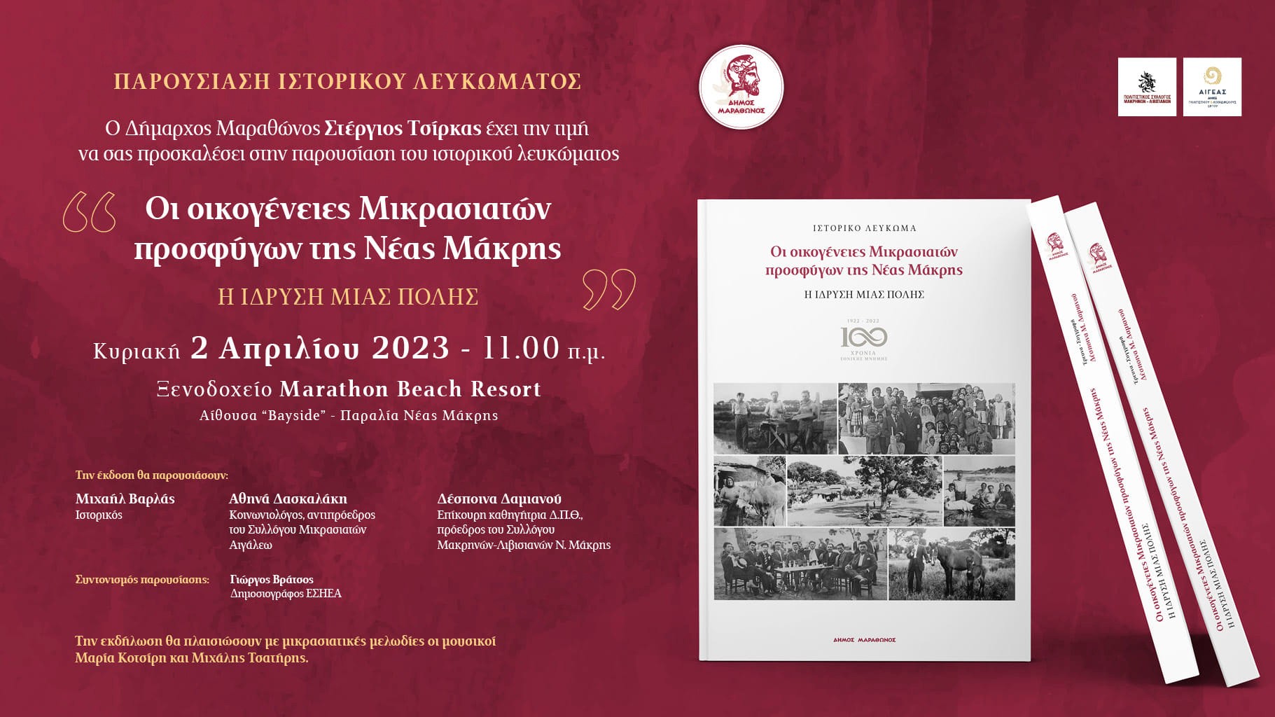 Ο Δήμαρχος Μαραθώνος Στέργιος Τσίρκας έχει την τιμή να σας προσκαλέσει αυτήν την Κυριακή 2 Απριλίου 2023 και ώρα 11.00 πμ στην παρουσίαση του ιστορικού Λευκώματος «Οι οικογένειες Μικρασιατών προσφύγων της Νέας Μάκρης-Η ίδρυση μιας πόλης», η οποία θα πραγματοποιηθεί στο ξενοδοχείο Marathon Beach Resort, Αίθουσα «Bayside», Λ. Ποσειδώνος 12 στην παραλία της Νέας Μάκρης.