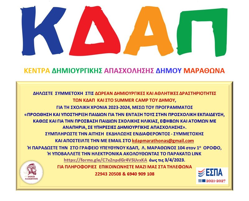 Για συμμετοχή στα ΚΔΑΠ του Δήμoυ Μαραθώνος για τη σχολική χρονιά 2023-2024, υποβάλλετε ηλεκτρονικά αίτηση εκδήλωσης ενδιαφέροντος ακουθώντας το παρακάτω link:
