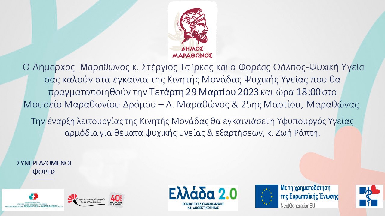 Ο Δήμαρχος Μαραθώνος Στέργιος Τσίρκας έχει την τιμή να σας προσκαλέσει στα εγκαίνια της Κινητής Μονάδας του Φορέα «Θάλπος-Ψυχική Υγεία» που θα πραγματοποιηθούν την Τετάρτη 29 Μαρτίου 2023 και ώρα 18:00 στο Μουσείο Μαραθωνίου Δρόμου, Λ. Μαραθώνος & 25ης Μαρτίου στο Μαραθώνα.