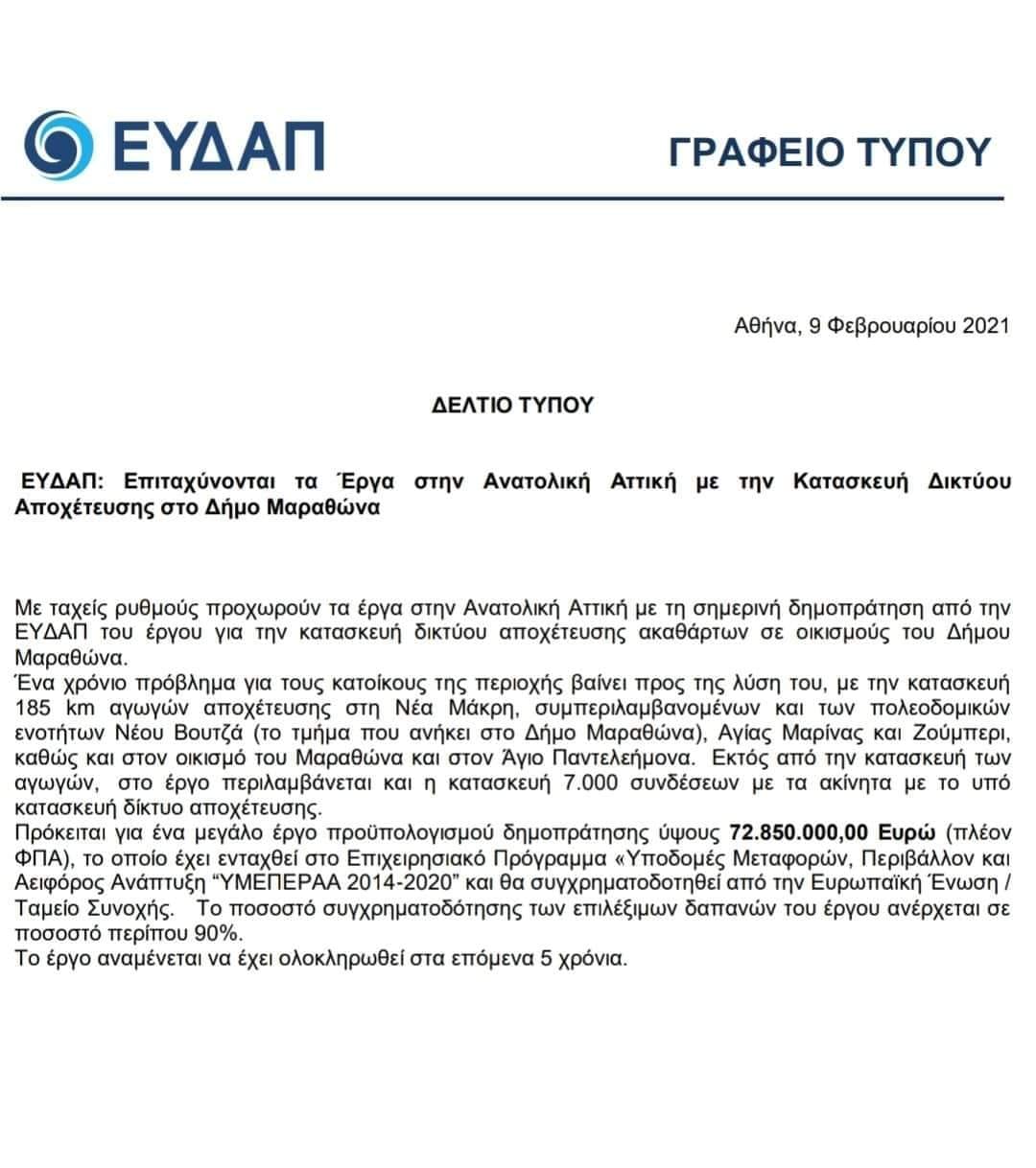 ο μεγαλύτερο αναπτυξιακό έργοτου Δήμου Μαραθώνος μπαίνει σε πλέον στην τελική τροχιά υλοποίησής του. Η ΕΥΔΑΠ, που είναι ο δικαιούχος φορέας δημοπράτησης και ανάθεσης, ανακοίνωσε την δημοπράτηση της κατασκευής του Δικτύου Αποχέτευσης Ακαθάρτων στους οικισμούς του Δήμου μας.