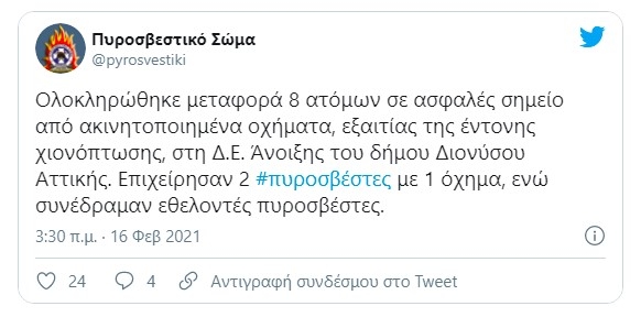 Κατά τη διάρκεια της νύχτας αναμένουμε νέα χιονόπτωση και σας παρακαλούμε πολύ κατά τις πρωινές ώρες να δείξετε ιδιαίτερη προσοχή στις μετακινήσεις σας."