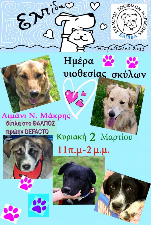 Ενημερώνουμε τους δημότες ότι την ερχόμενη Κυριακή, 2 Μαρτίου 2025, ο Σύλλογος Ζωοφίλων Μαραθώνα “ΕΛΠΙΔΑ” διοργανώνει μέρα υιοθεσίας σκύλων, στο χώρο δίπλα στο “ΘΑΛΠΟΣ”, στο λιμανάκι Νέας Μάκρης.