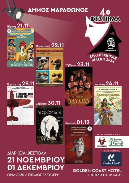 Με τρεις μοναδικές παραστάσεις -και ελεύθερη είσοδο- συνεχίζεται την προσεχή Παρασκευή 29 Νοεμβρίου, το Σάββατο 30 Νοεμβρίου & την Κυριακή 1 Δεκεμβρίου 2024 (έναρξη στις 8.30μμ) το “4ο Φεστιβάλ Ερασιτεχνικών Θιάσων Δήμου Μαραθώνα” στο Ξενοδοχείο Golden Coast.