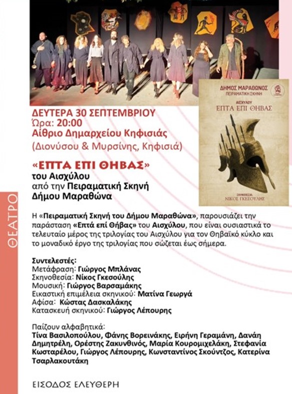 .Σήμερα Δευτέρα 30 Σεπτεμβρίου 2024 (8μμ) η Πειραματική Σκηνή ανεβάζει την παράσταση "Επτά Επί Θήβας" στην Κηφισία (Διονύσου & Μυρσίνης) στο πλαίσιο του φεστιβάλ "Μενάνδρεια 2024"