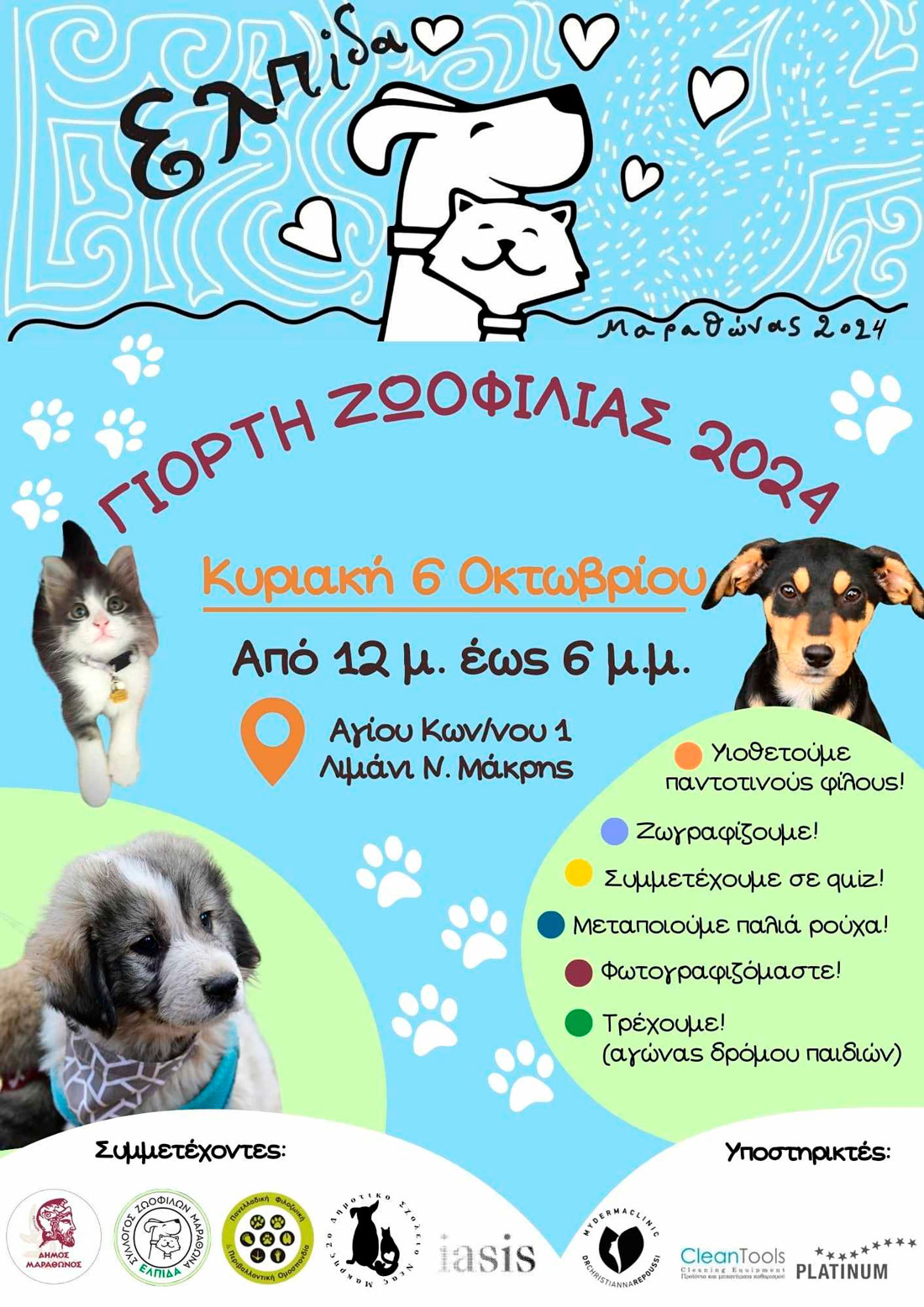 O Σύλλογος Ζωόφιλων Μαραθώνα “Ελπίδα”, σε συνεργασία με το Δήμο Μαραθώνος, διοργανώνει την Κυριακή, 6 Οκτωβρίου, από τις 12 το μεσημέρι έως και τις 6 το απόγευμα, τη μεγαλύτερη γιορτή για τα αδέσποτα του Δήμου μας και για την εξοικείωση των μικρών παιδιών με τις έννοιες της ζωοφιλίας, της προστασίας και φροντίδας, αλλά και των δικαιωμάτων των ζώων, συντροφιάς και άγριας πανίδας.
