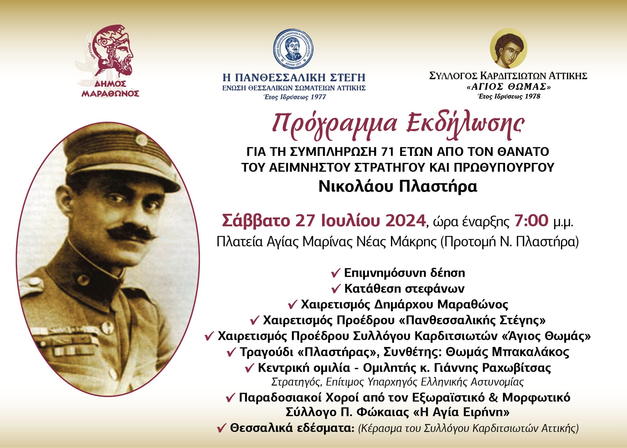 Αυτό το Σάββατο 27 Ιουλίου 2024 (7μμ) στην Αγία Μαρίνα Νέας Μάκρης, τιμούμε την συμπλήρωση των 71 ετών από τον θάνατο του Νικ.Πλαστήρα.