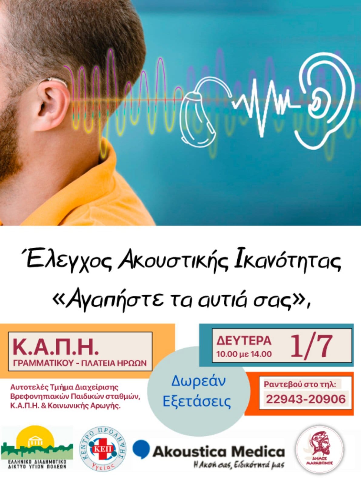 Σήμερα, Δευτέρα, 01 Ιουλίου 2024, πραγματοποιήθηκε Έλεγχος Ακουστικής Ικανότητας στο ΚΑΠΗ ΓΡΑΜΜΑΤΙΚΟΥ, μία δράση ανοιχτή για τον γενικό πληθυσμό από το ΚΕΠ Υγείας Δήμου Μαραθώνος σε συνεργασία με το ΕΔΔΥΠΠΥ και το Αυτοτελές Τμήμα Διαχείρισης Βρεφ/κών σταθμών- ΚΑΠΗ Δήμου Μαραθώνος