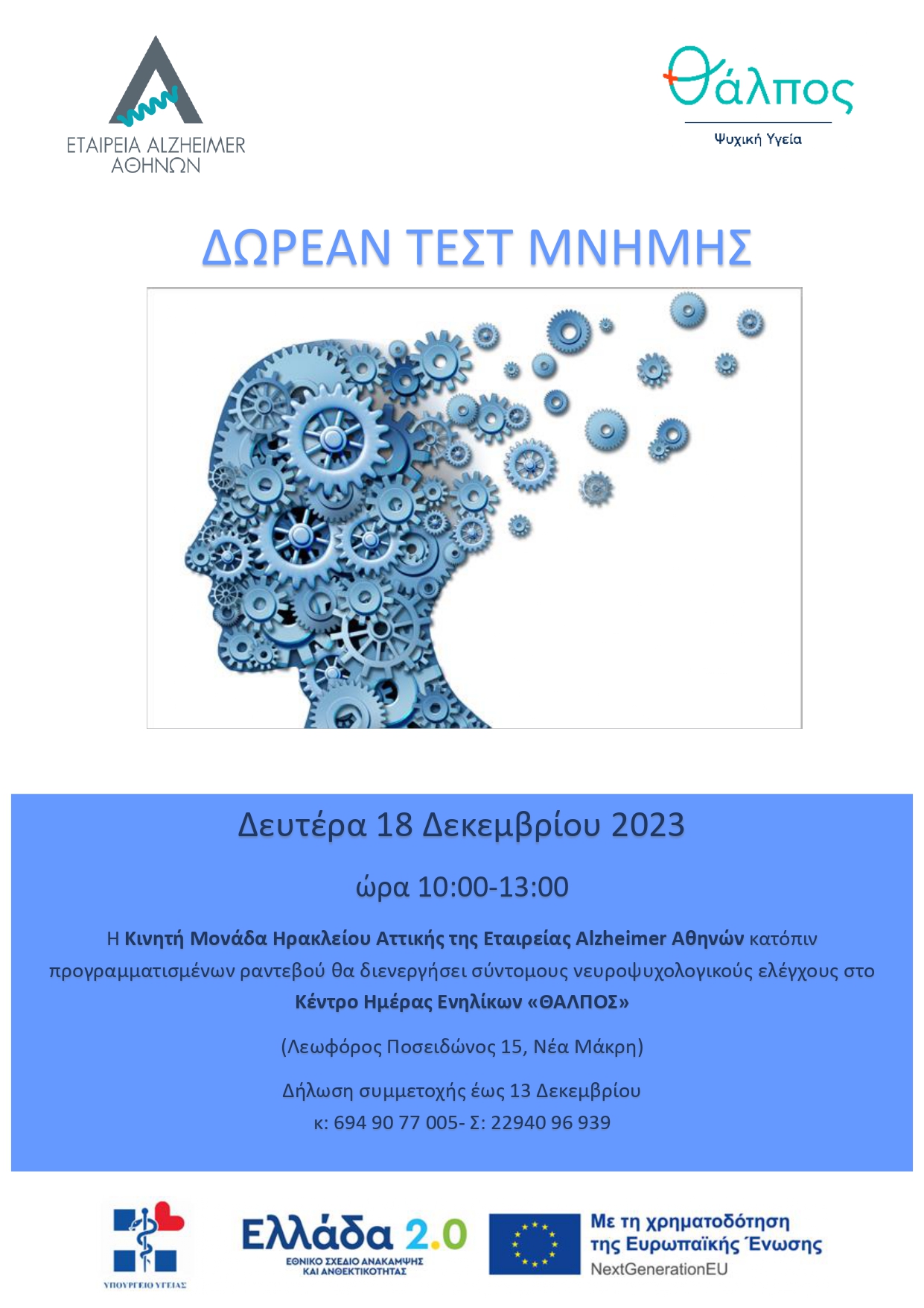 Δωρεάν τεστ μνήμης στον Δήμο Μαραθώνος την Δευτέρα 18 Δεκεμβρίου 2023.