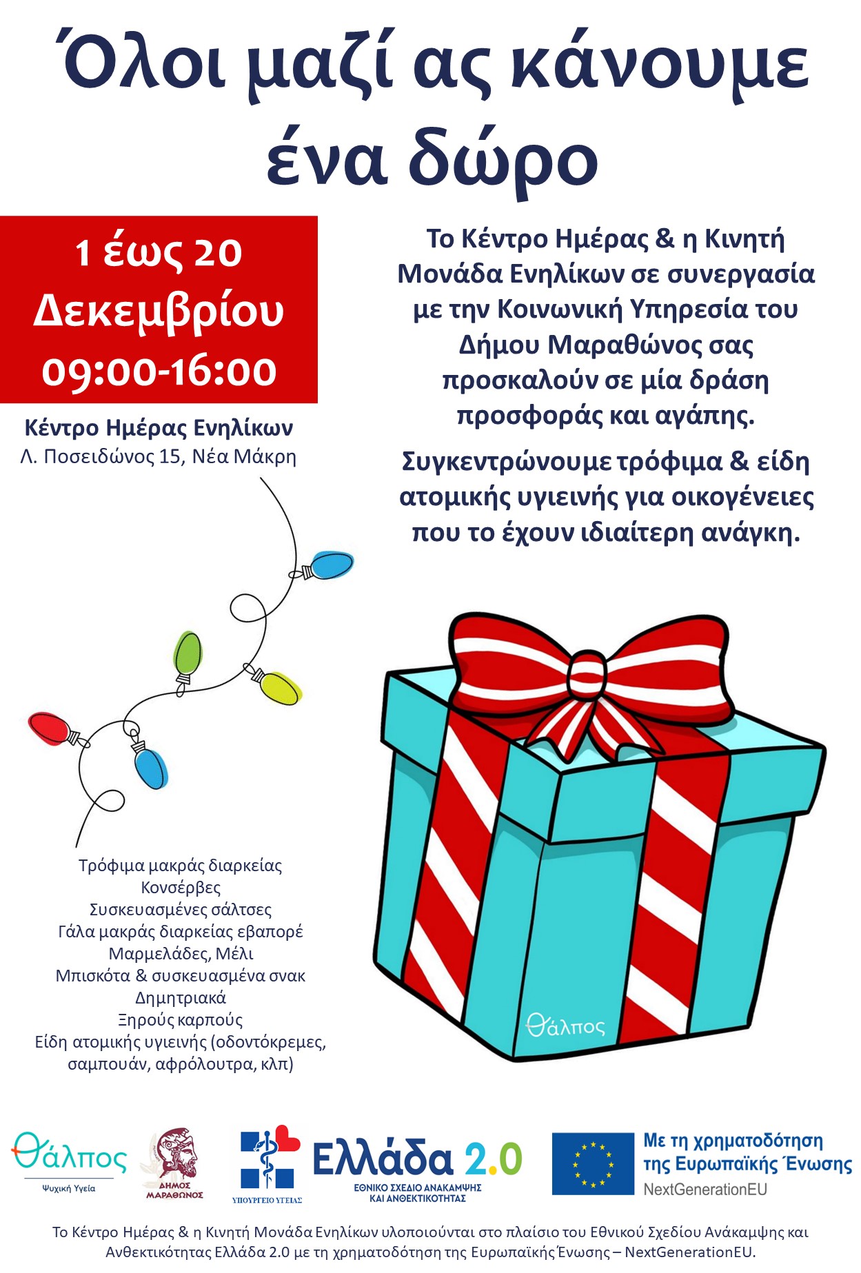 Το Κέντρο Ημέρας και η Κινητή Μονάδα Ενηλίκων του Φορέα «Θάλπος-Ψυχική Υγεία» σε συνεργασία με την Κοινωνική Υπηρεσία του Δήμου Μαραθώνος, σας προσκαλούν σε μια δράση προσφοράς και αγάπης, ενόψει των Χριστουγέννων.