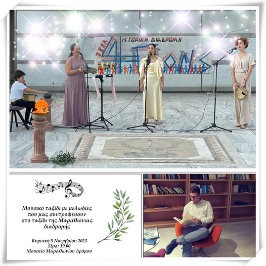 ην Κυριακή 5 Νοεμβρίου στις 19:00 θα πραγματοποιηθεί στο Μουσείο Μαραθωνίου Δρόμου η μουσική εκδήλωση με τίτλο «Μουσικό ταξίδι με μελωδίες που μας συντροφεύουν στο ταξίδι της Μαραθώνιας διαδρομής».