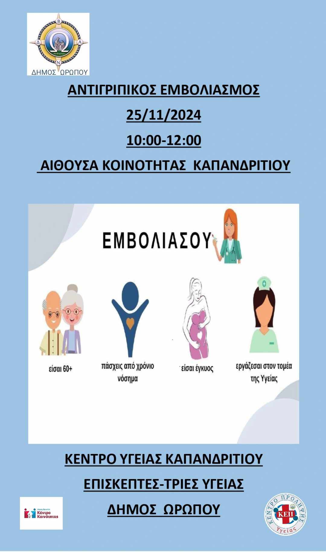 Ο Δήμος Ωρωπού και το Κ.Ε.Π. Υγείας του Δήμου, σε συνεργασία με το τμήμα Επισκεπτών-τριών Υγείας του Κέντρου Υγείας Καπανδριτίου και Iατρό του ΚΥΚ, με στόχο την ενίσχυση του αριθμού των έγκαιρα εμβολιασμένων πολιτών, οργανώνουν ενημέρωση και διενέργεια αντιγριπικού εμβολιασμού σε όσους το επιθυμούν.