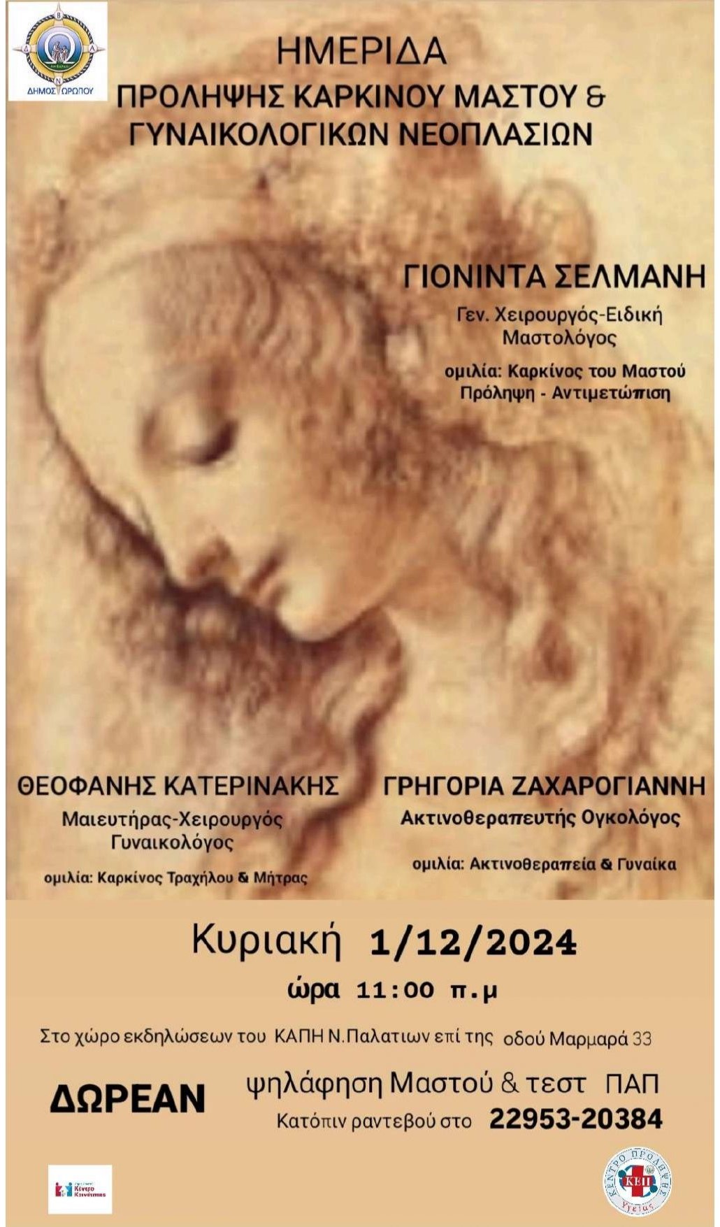 Ο Δήμος Ωρωπού και το Κ.Ε.Π. Υγείας του Δήμου οργανώνουν σε συνεργασία με την Γιονίντα Σελμάνη Γενικό Χειρουργό - Ειδική Μαστολόγο, τον Θεοφάνη Κατερινάκη Μαιευτήρα - Χειρουργό Γυναικολόγο, και την Ζαχαρογιάννη Γρηγορία, Ακτινοθεραπευτή Ογκολόγο, ημερίδα ενημέρωσης, ευαισθητοποίησης και πρόληψης των γυναικών, η οποία θα περιλαμβάνει και προληπτικές εξετάσεις από τους εξειδικευμένους Ιατρούς (προληπτικός έλεγχος μαστών & τεστ ΠΑΠ).