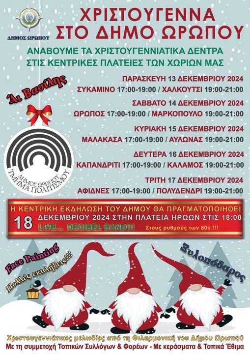 Με το άναμμα του χριστουγεννιάτικου δέντρου στην πλατεία Ηρώων από τις Δημοτικές Ενότητες των Νέων Παλατιών και της Σκάλας Ωρωπού με την ευθύνη του Τμήματος Πολιτισμού του Δήμου Ωρωπού κορυφώθηκαν οι χριστουγεννιάτικες εκδηλώσεις στο Δήμο Ωρωπού.