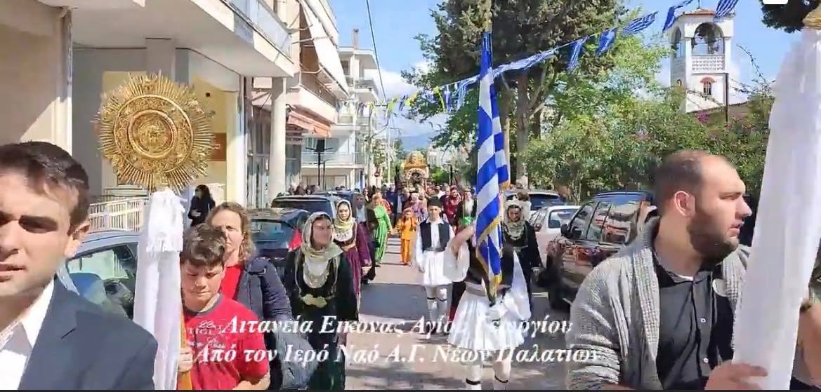 Η καλοκαιρία έδωσε την ευκαιρία στους πιστούς για να πραγματοποιήσουν το πρωί της Κυριακής ανήμερα του Αγίου Γεωργίου τη λιτανεία της σεπτής Ιεράς Εικόνας του Αγίου Γεωργίου στα Νέα Παλάτια του Δήμου Ωρωπού. Και του χρόνου
