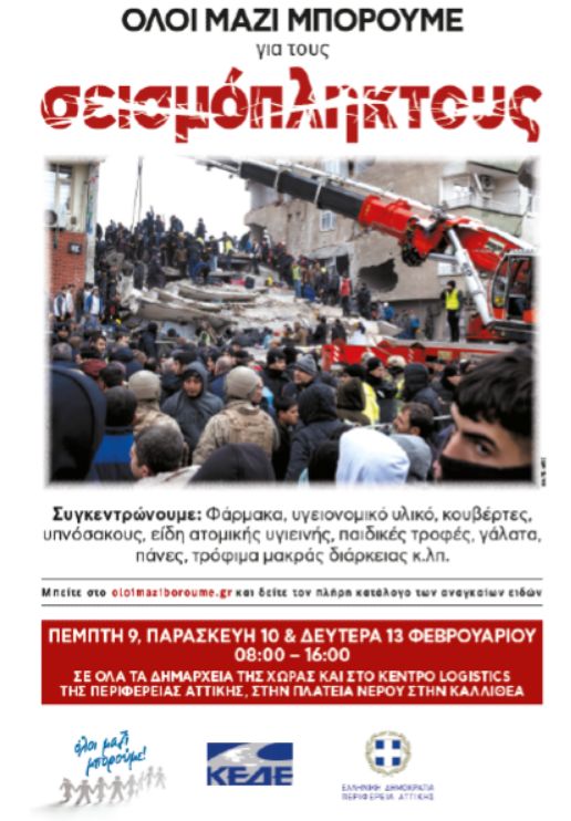 Ο Δήμος Ωρωπού συμμετέχει στη δράση του ΟΛΟΙ ΜΑΖΙ ΜΠΟΡΟΥΜΕ και ΟΛΩΝ των Δήμων της χώρας, της ΚΕΔΕ και της Περιφέρειας Αττικής για τη συγκέντρωση τροφίμων, παιδικών τροφών, φαρμάκων, υγειονομικού υλικού, κουβερτών, υπνόσακων από σήμερα Πέμπτη 9 Φεβρουαρίου μέχρι και τη Δευτέρα 13 Φεβρουαρίου στο Δημαρχείο του Δήμου μας από 08:00 έως 16:00. Όλοι μαζί μπορούμε για τους σεισμόπληκτους.