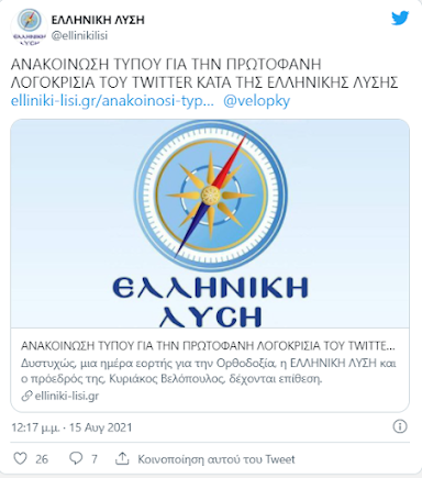 Όπως καταγγέλλει σε ανακοίνωσή της η Ελληνική Λύση, «δυστυχώς, μια ημέρα εορτής για την Ορθοδοξία, η Ελληνική Λύση και ο πρόεδρός της, Κυριάκος Βελόπουλος, δέχονται επίθεση. Την στιγμή που ακόμα και ο εκπρόσωπος των Ταλιμπάν διατηρεί λογαριασμό στο συγκεκριμένο μέσο ανενόχλητος, το Twitter ανέστειλε τη λειτουργία τού λογαριασμού των ανακοινώσεων της Ελληνικής Λύσης και του προέδρου της, Κυριάκου Βελόπουλου».