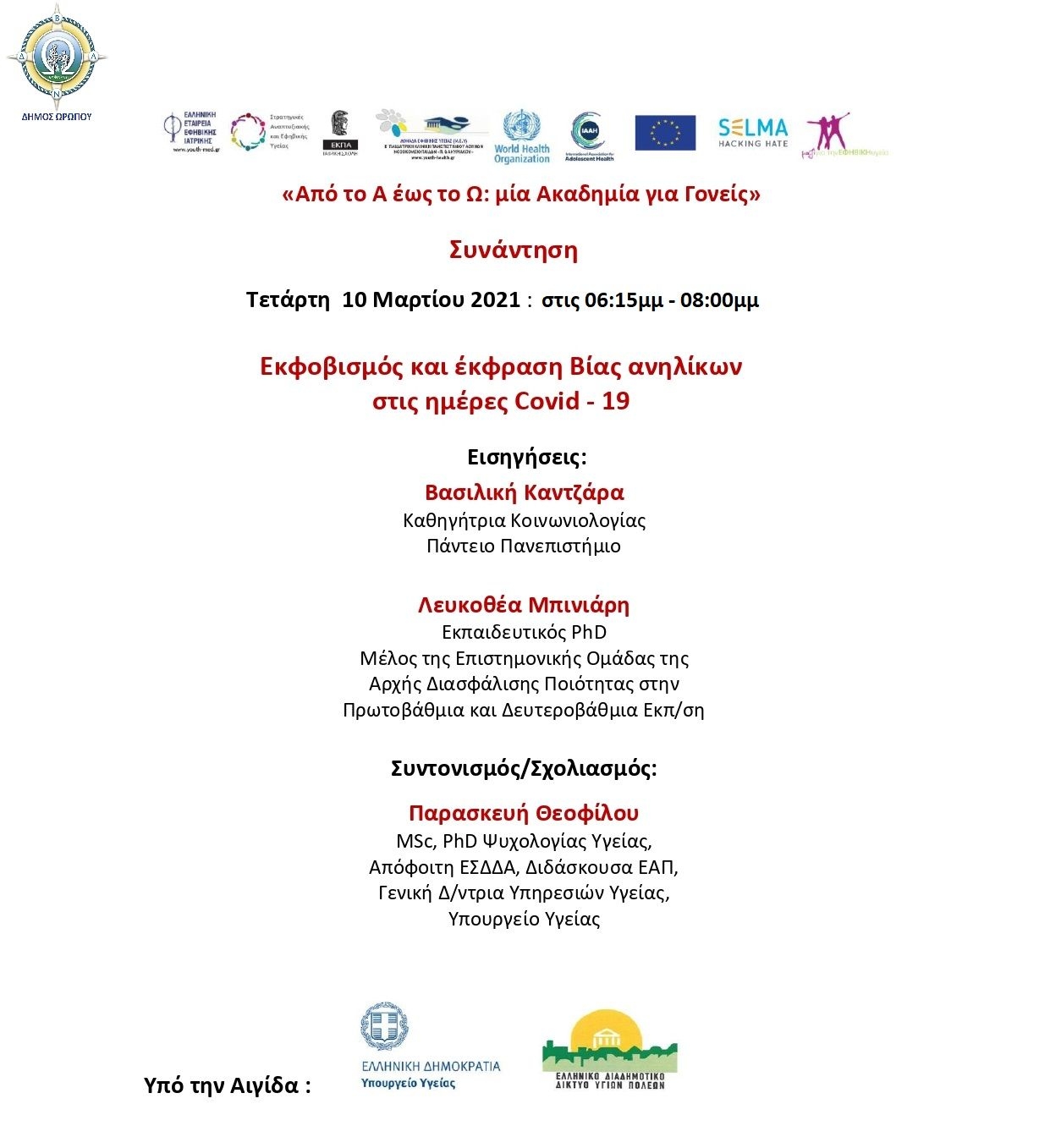 Για να παρακολουθήσετε τη Συνάντηση της Ακαδημίας Γονέων θα ακολουθήσετε το link στο You Tube: https://www.youtube.com/watch?v=_58-DcmKbsE