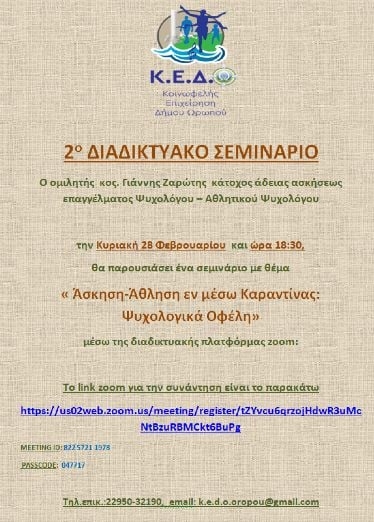 Η Κοινωφελής Επιχείρηση Δήμου Ωρωπού διοργανώνει το 2ο Διαδικτυακό Σεμινάριο με θέμα «Άσκηση - Άθληση εν μέσω Καραντίνας: Ψυχολογικά Οφέλη» την Κυριακή 28 Φεβρουαρίου και ώρα 18:30