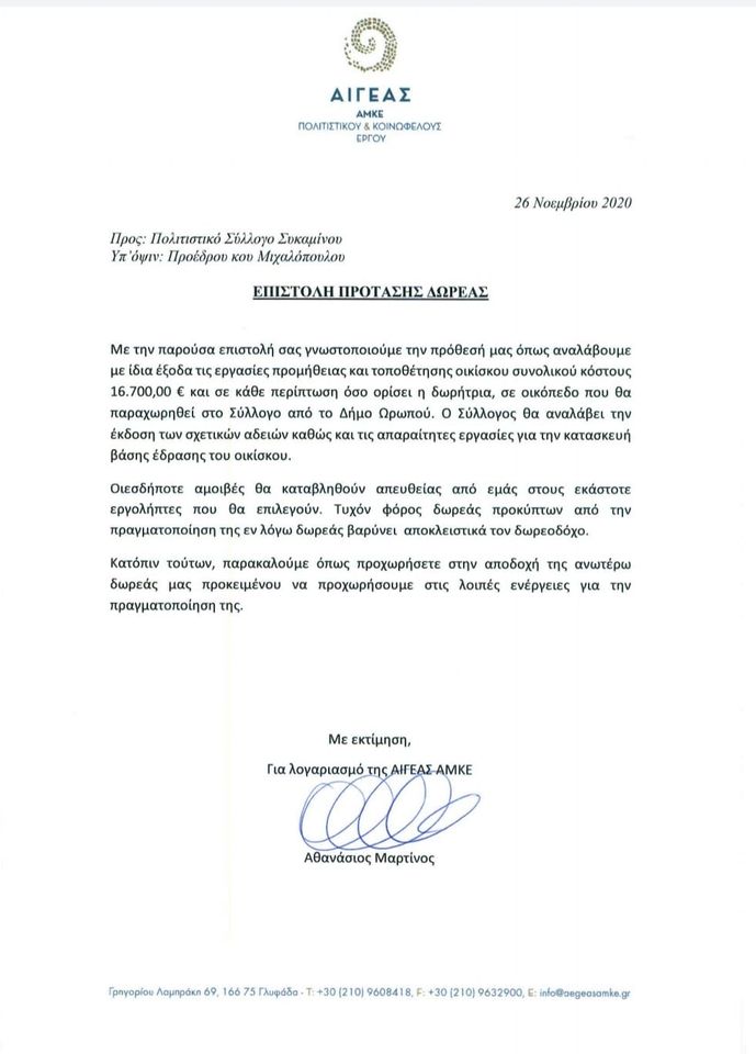 Θέλουμε να ευχαριστήσουμε θερμά τον κ. Μαρτίνο για την δωρεά του, όπως και το τοπικό Συμβούλιο Συκαμίνου που με την 27/2020 απόφαση του αποδέχεται την παραχώρηση χώρου για την τοποθέτηση.
