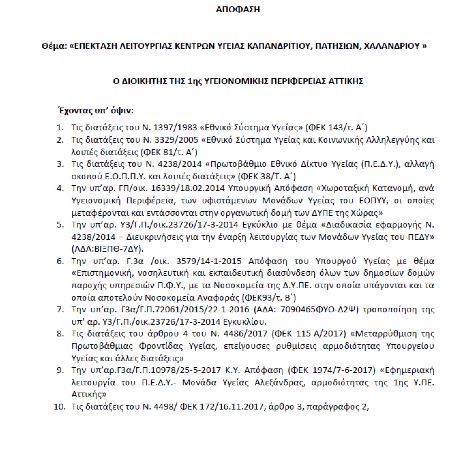 Mε απόφαση της 1ης Υ.ΠΕ. Αττικής Διεύθυνση Δημόσιας Υγείας (αρ.πρωτοκόλλου 54363) που υπογράφηκε από τον Διοικητή κ. Παναγιώτη Στάθη και αναρτήθηκε στο διαδίκτυο στις 5 Δεκεμβρίου 2020 επεκτείνεται η λειτουργία τριών Κέντρων Υγείας μεταξύ αυτών και το Κέντρο Υγείας Καπανδριτίου.